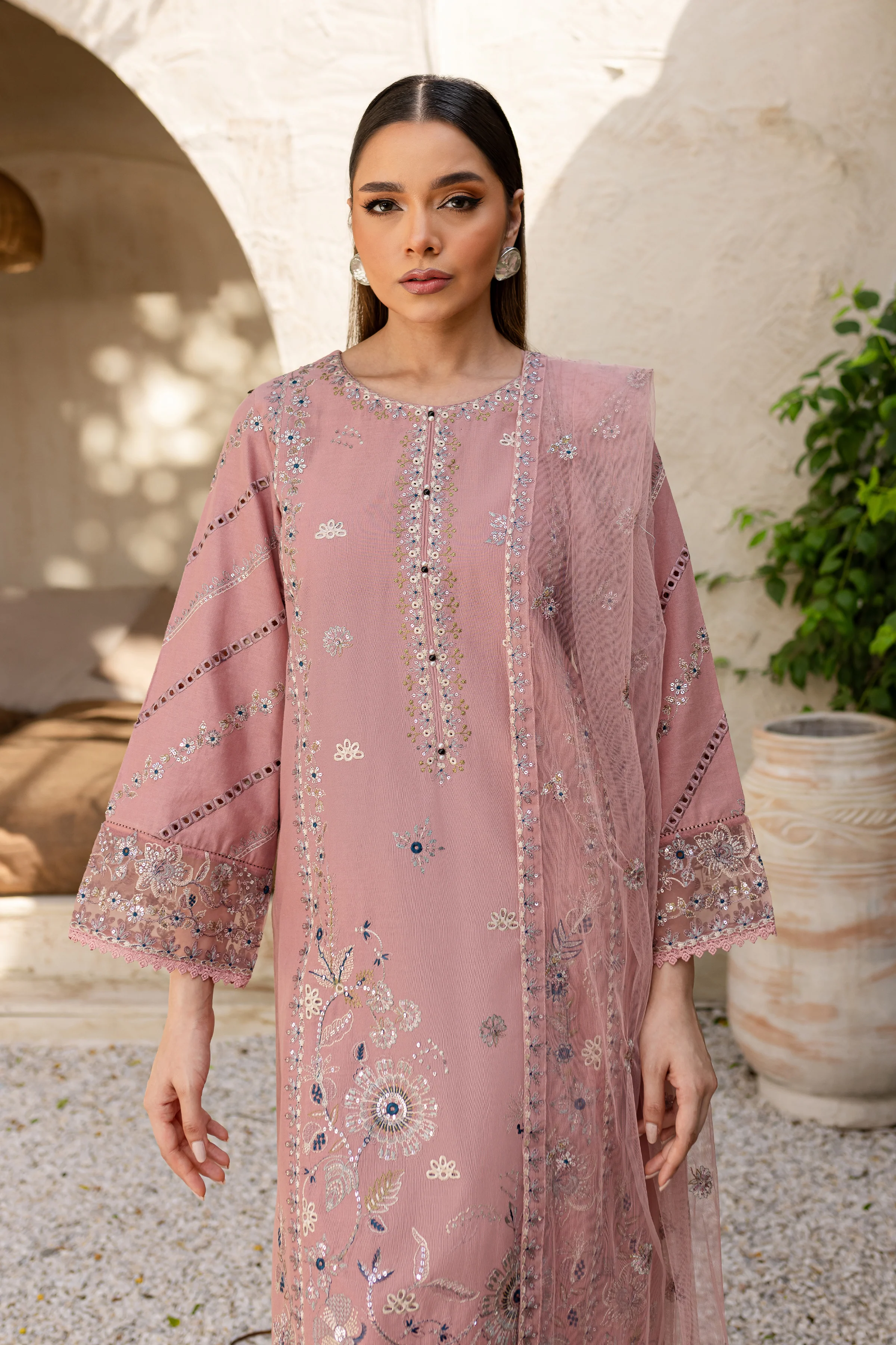 Eira is a soft tea pink khaddar ensemble, perfect for a graceful yet vibrant look. The shirt is fully embroidered with panel detailing, creating a rich texture and is elegantly finished with an organza border and lace trim along the hem.