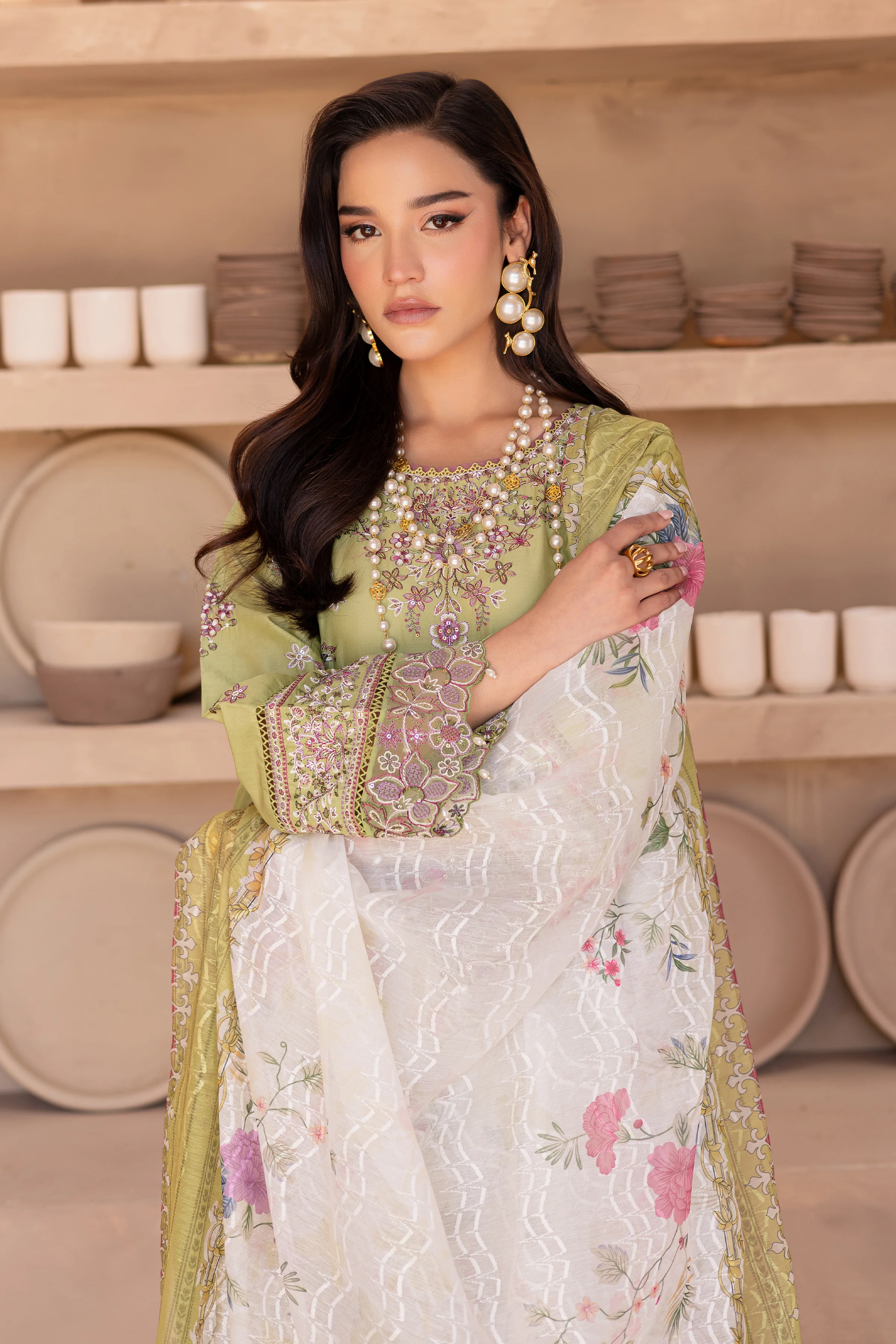 The ensemble is completed with a digitally printed dupatta, adding a modern flair and perfectly balancing the traditional embroidery with contemporary design elements.
