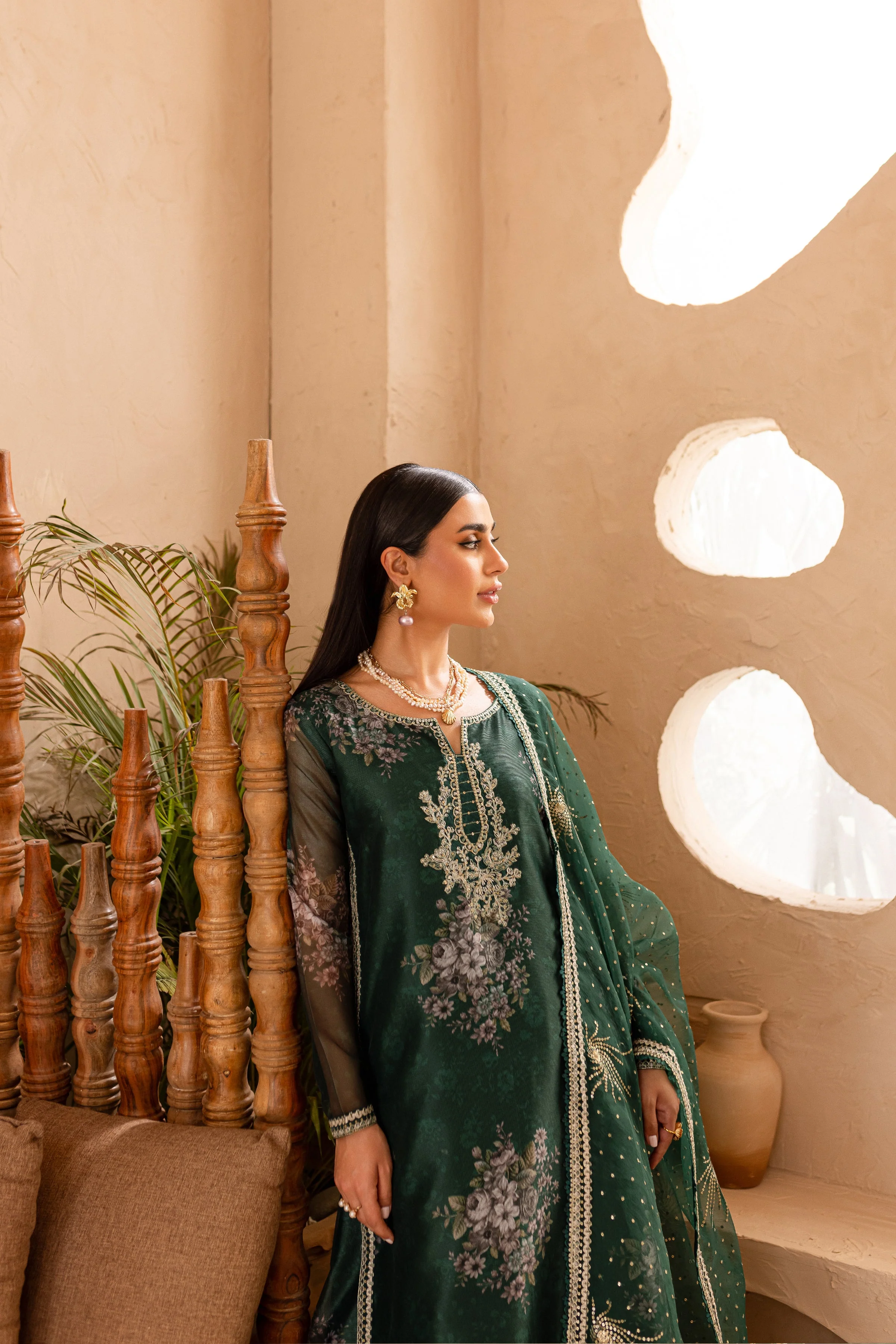 Add an elegant touch to your festive look by opting for our premium ensemble in the shades of green, exhibiting a contemporary look with a subtle sheen.