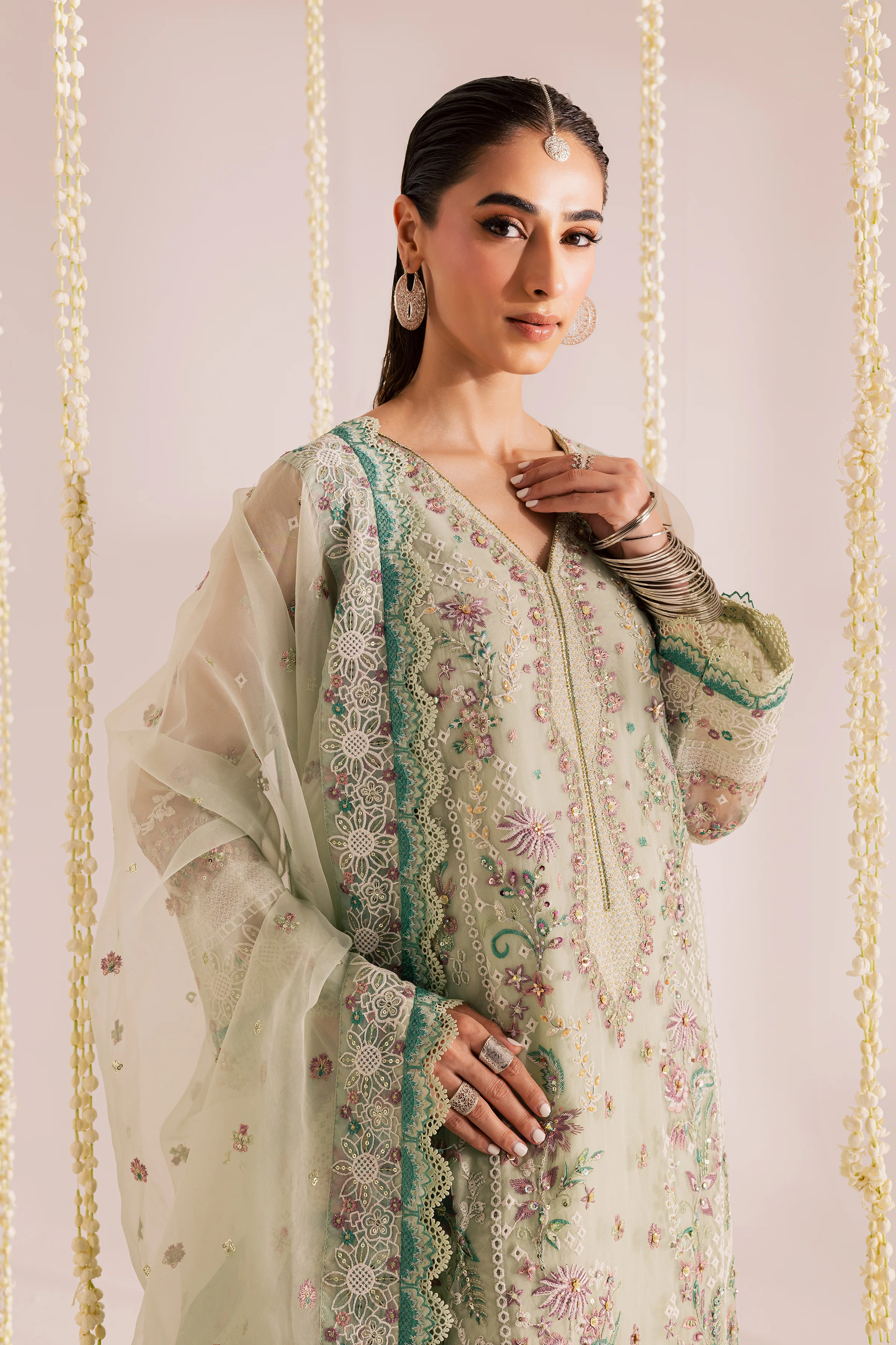 Labeeba is a graceful ensemble featuring a fully embroidered organza pastel green shirt with delicate Adda work, paneled stitching, and a finished hem with organza border and crochet lace. The embroidered sleeves are elegantly completed with border and lace finishing, adding to the refined look.