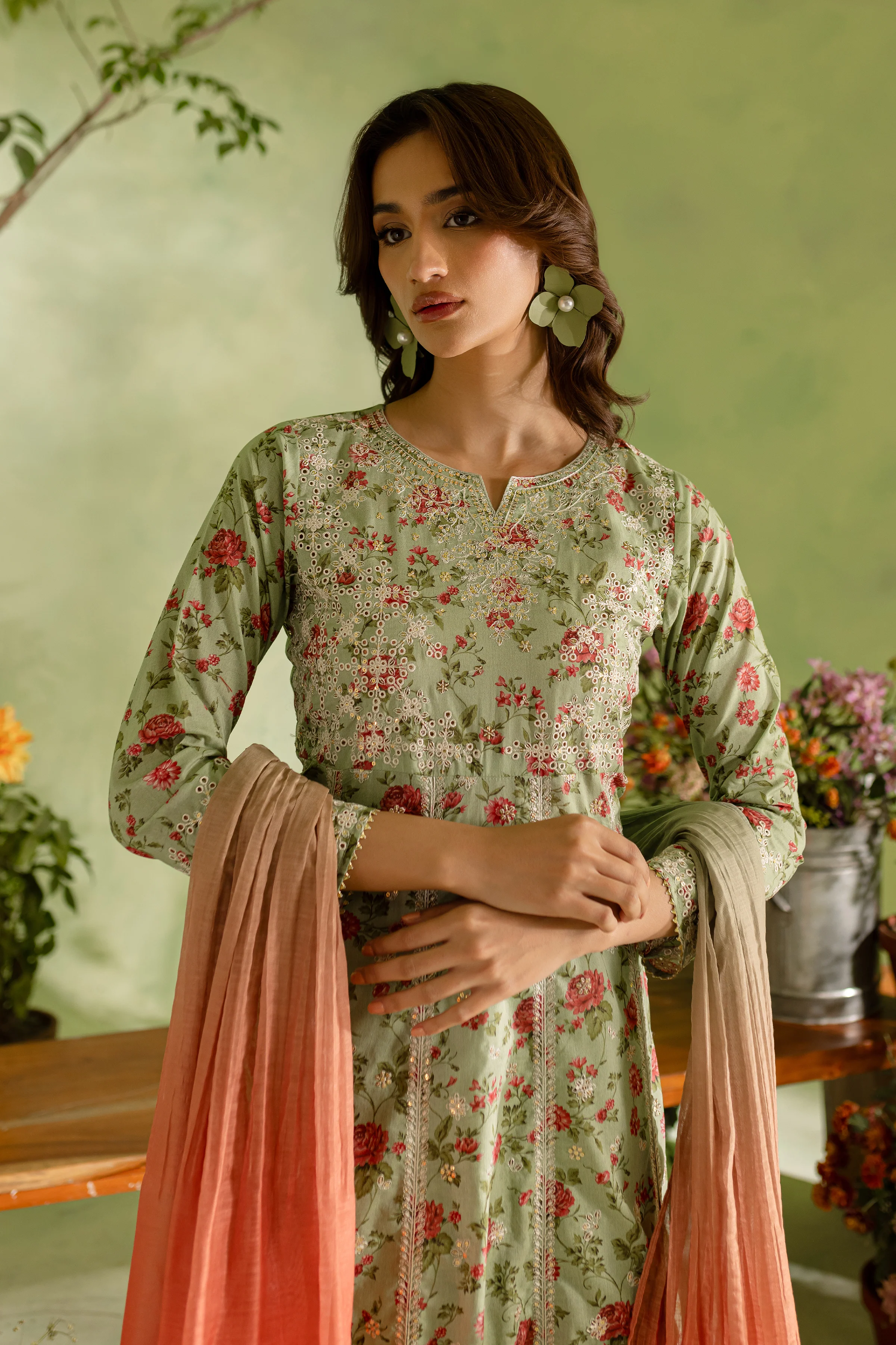 The mint green digital printed lawn panelled frock features a striking, bold print complemented by a heavy embroidered yoke and detailed embroidery on the panels. The intricate work adds depth and richness to the frock, making it a perfect blend of modern design and traditional craftsmanship.