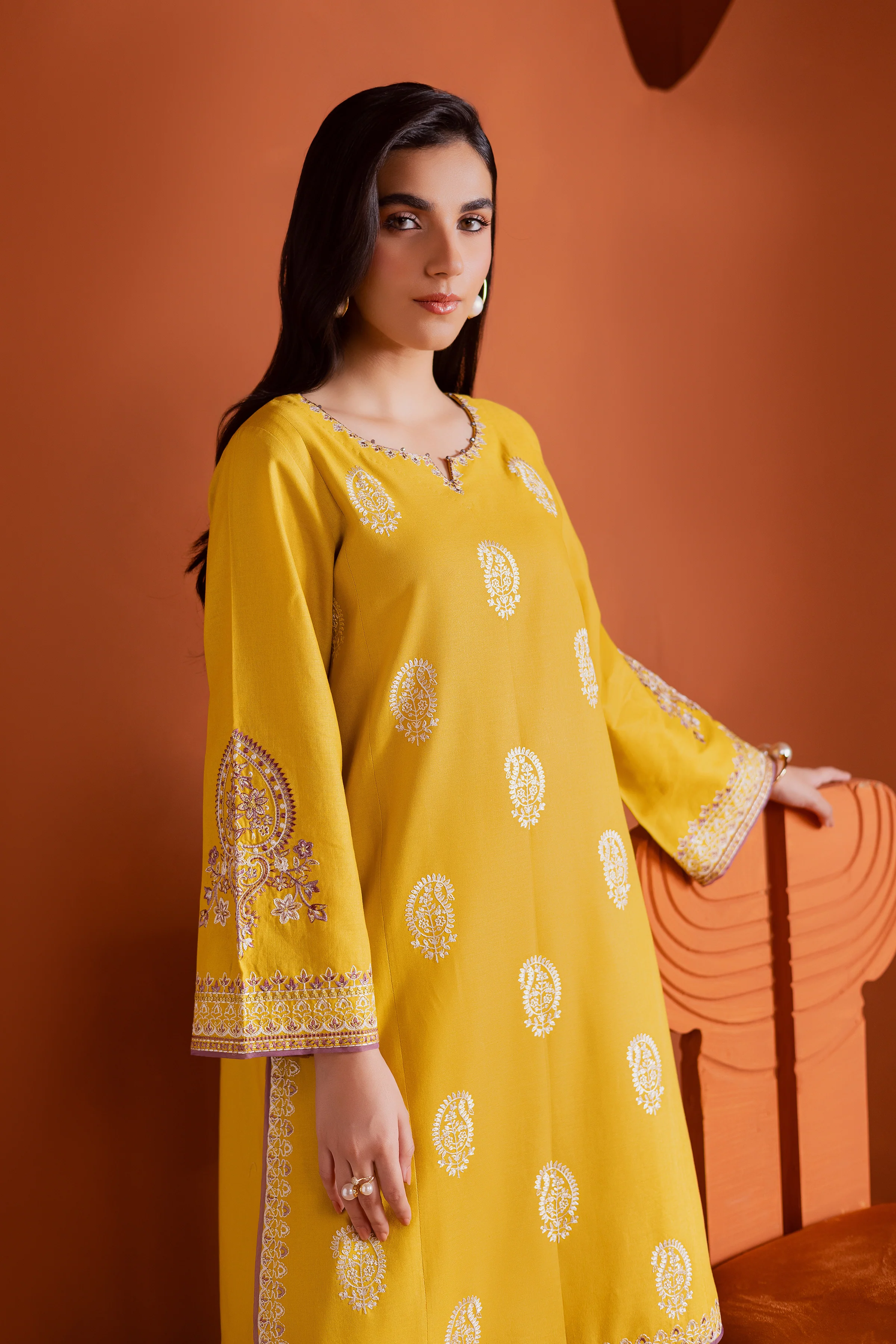 Fresh and graceful, the Lime two-piece khaddar set features a mid-length shirt in a soft lime hue, delicately adorned with white embroidery that traces intricate patterns along the neckline and sleeves. The elegant detailing adds a subtle charm to the overall design.