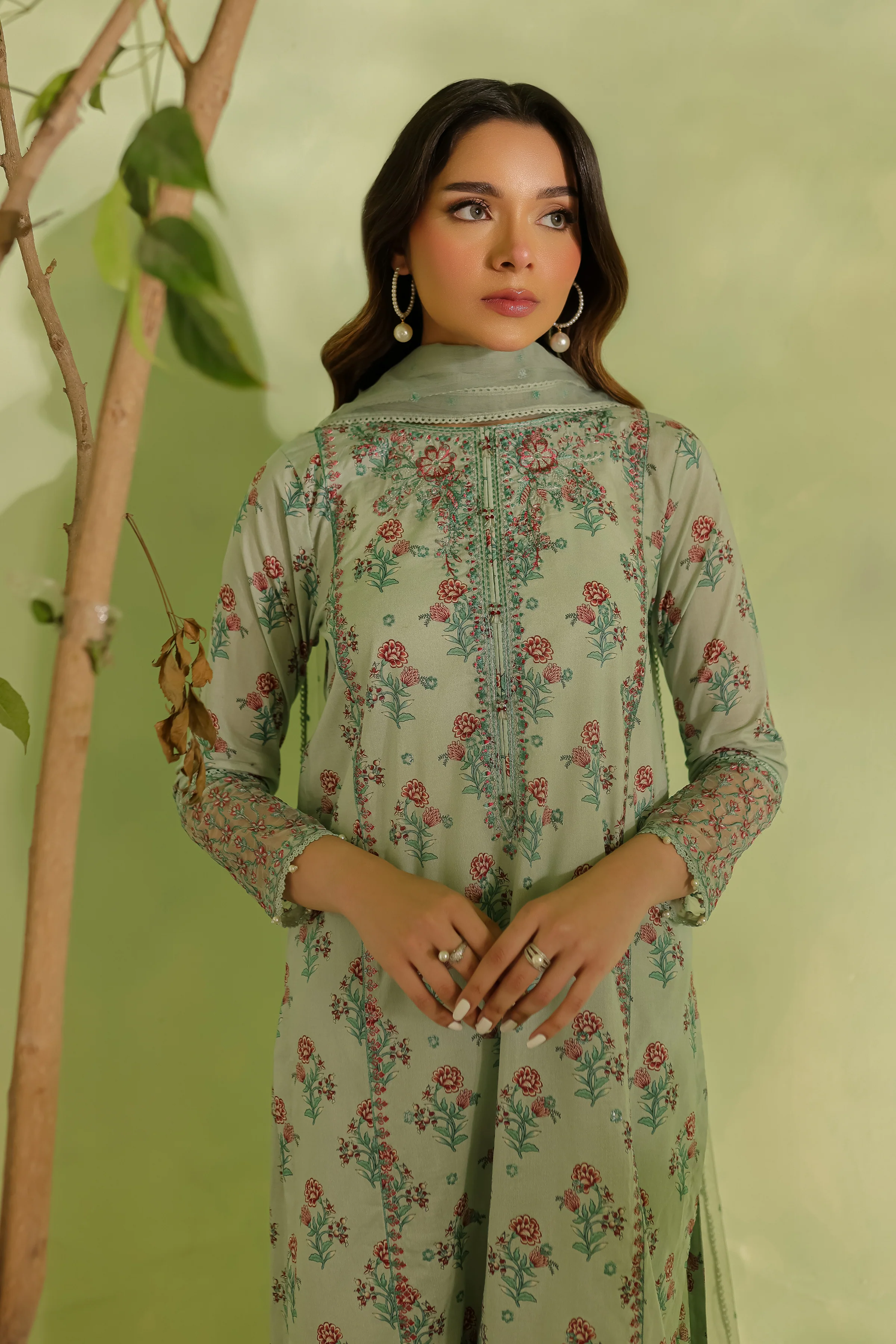 The sea green dual printed lawn panelled shirt features a striking combination of prints, creating a bold, contemporary design. The embroidered neckline and sleeves add a refined touch, with embellishments at the neckline enhancing the overall elegance of the shirt. The pearl lace detailing at the sleeves and shirt hem introduces a delicate, luxurious finish, elevating the piece with a soft, sophisticated touch.