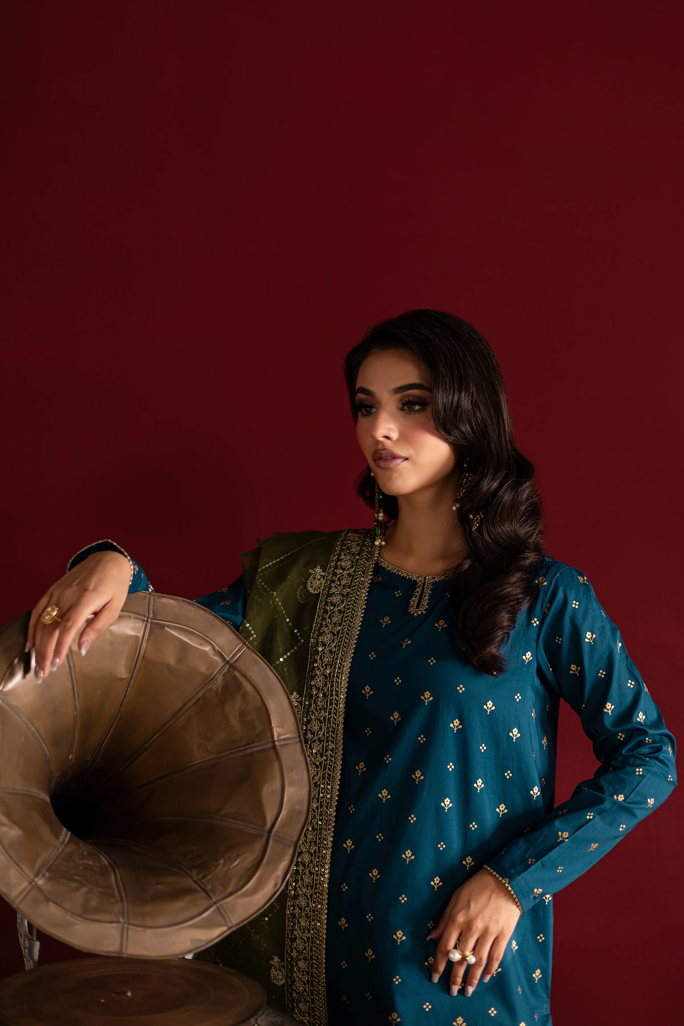 Paired with a classic shalwar, tailored from Egyptian cotton and adorned with a heavily embroidered hem that adds depth and drama to the overall look.