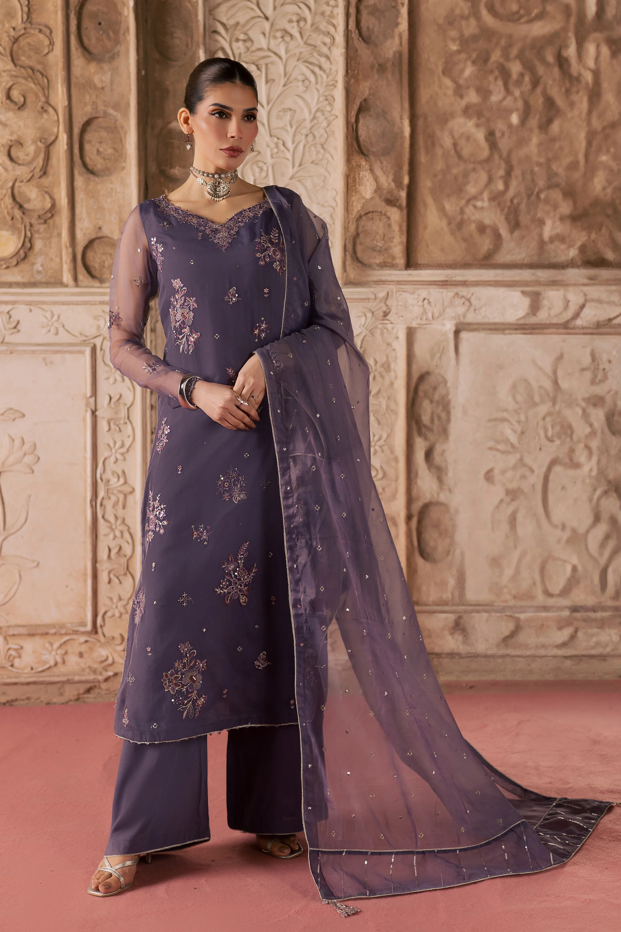 This long purple shirt is adorned with intricate embroidery, enhanced with crystal collage detailing along the neckline and sleeves for a refined finish. The embroidery adds depth while keeping the look elegant and composed.