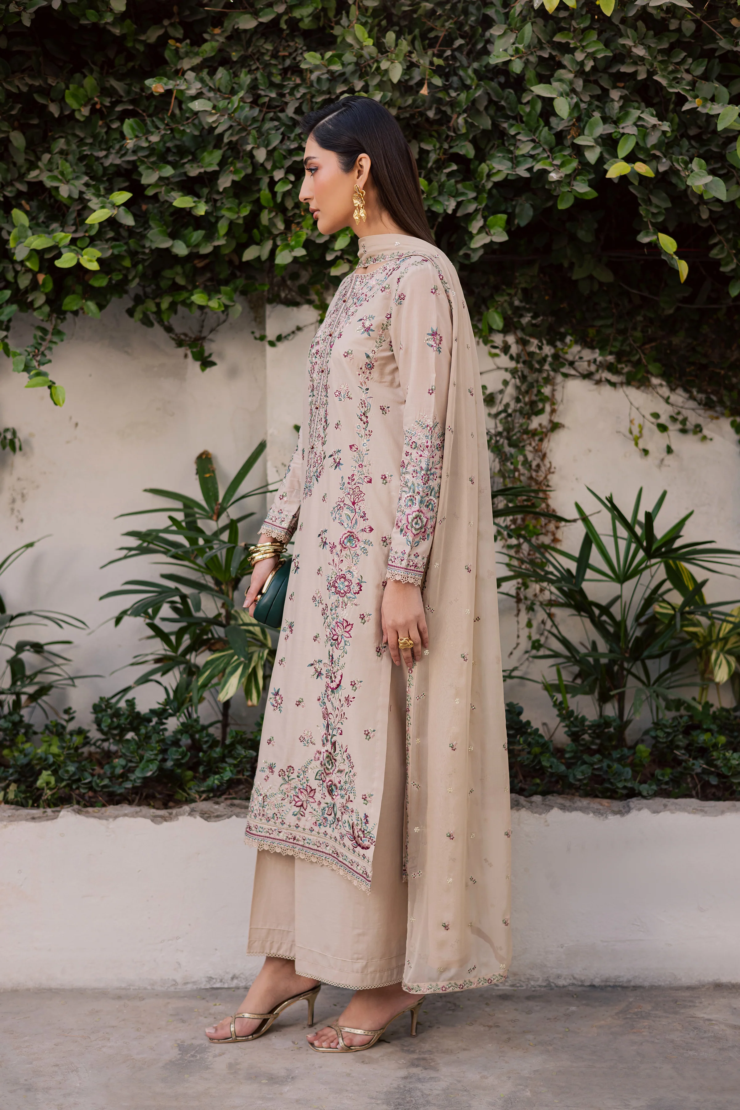 This Eid lawn set features a long embroidered shirt designed with a heavy composed hem and an intricately embroidered neckline. Delicate embellishments accent the neckline, while the fitted sleeves are detailed with composed motifs and an intricate embroidered border. All finishes across the shirt and sleeves are completed with lace, adding a refined festive touch. An embroidered border at the back further enhances the detailing.