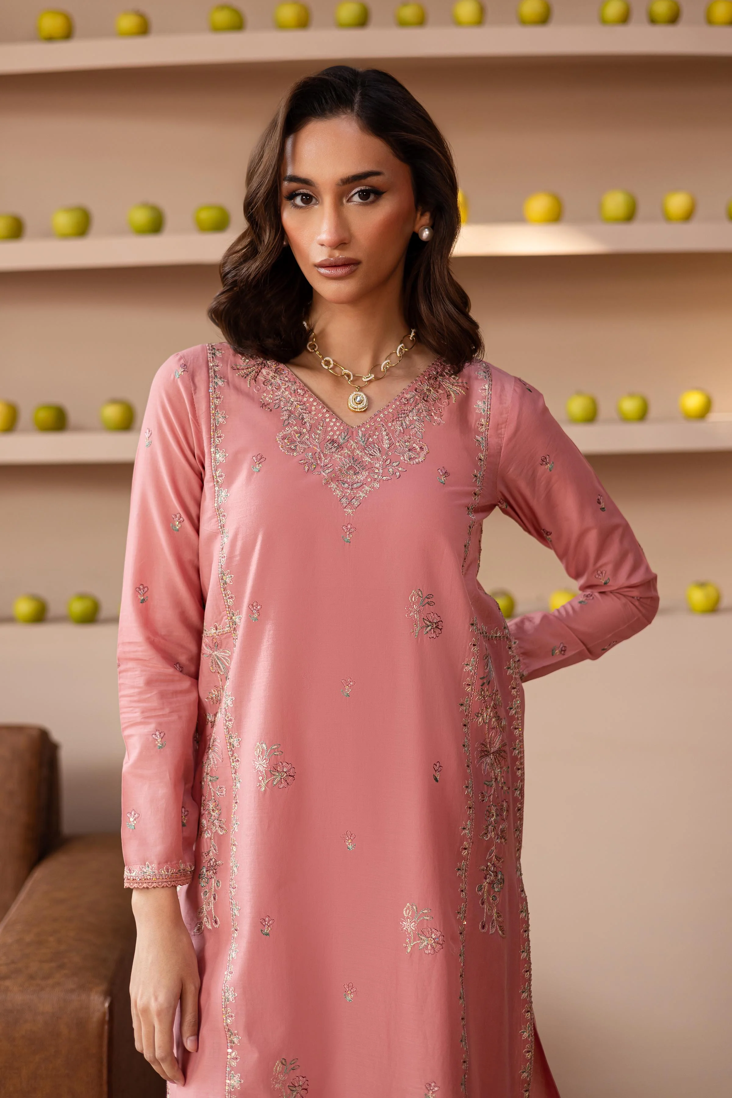 The outfit features a pima lawn dusty pink paneled shirt with a beautifully embroidered neckline, creating a focal point of intricate detailing. The side panels of the shirt are also embroidered, enhancing the overall design. The panels are carefully attached with gum salai, ensuring a smooth and seamless finish. The shirt is finished with lace for an added touch of elegance.