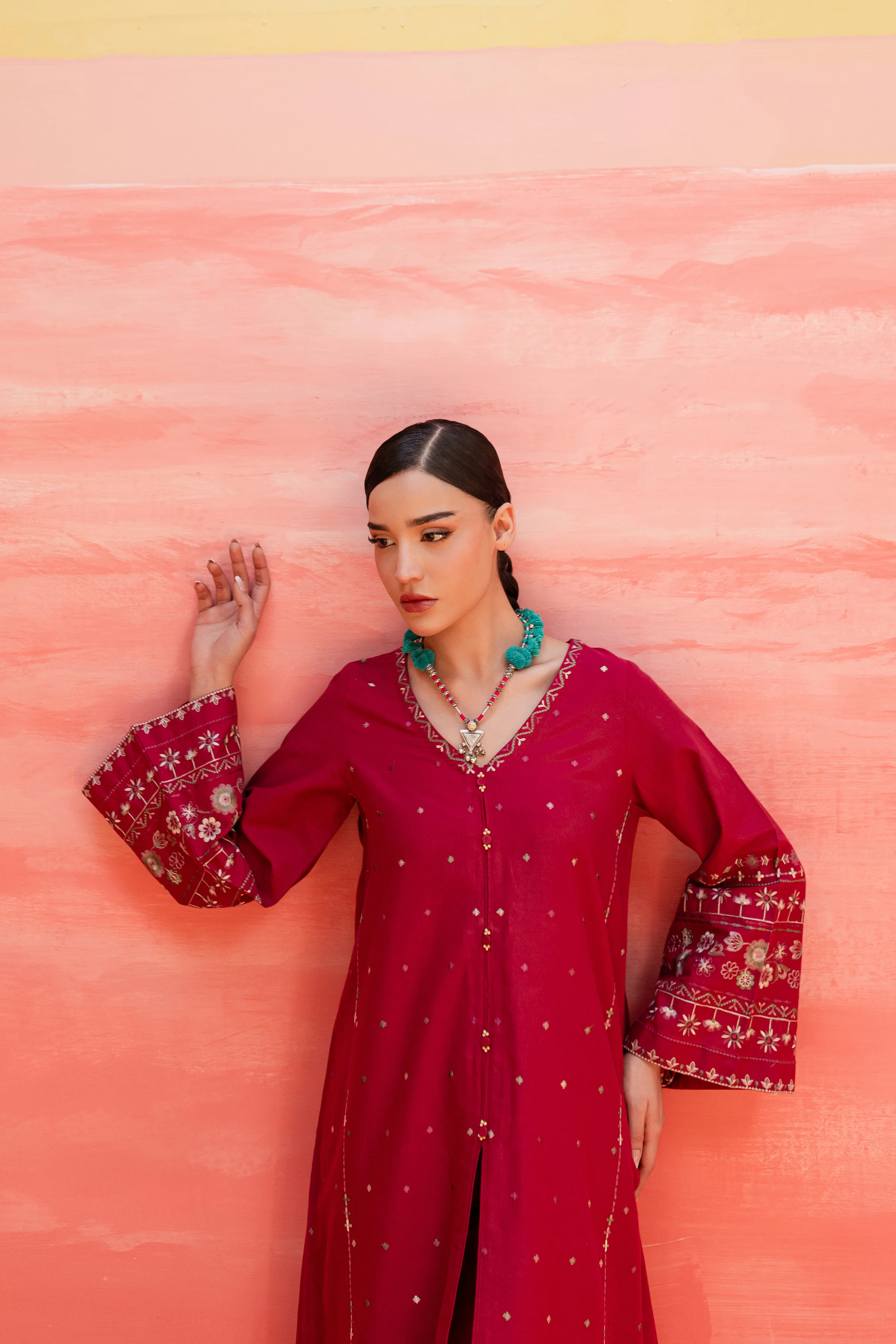 Effortlessly stylish, this embroidered khaddar 2-piece set combines modern design with subtle elegance. The fuschia pink front-open A-line shirt features minimal spread detailing and contemporary repeat embroidery on the sleeves, adding a touch of sophistication and craftsmanship.