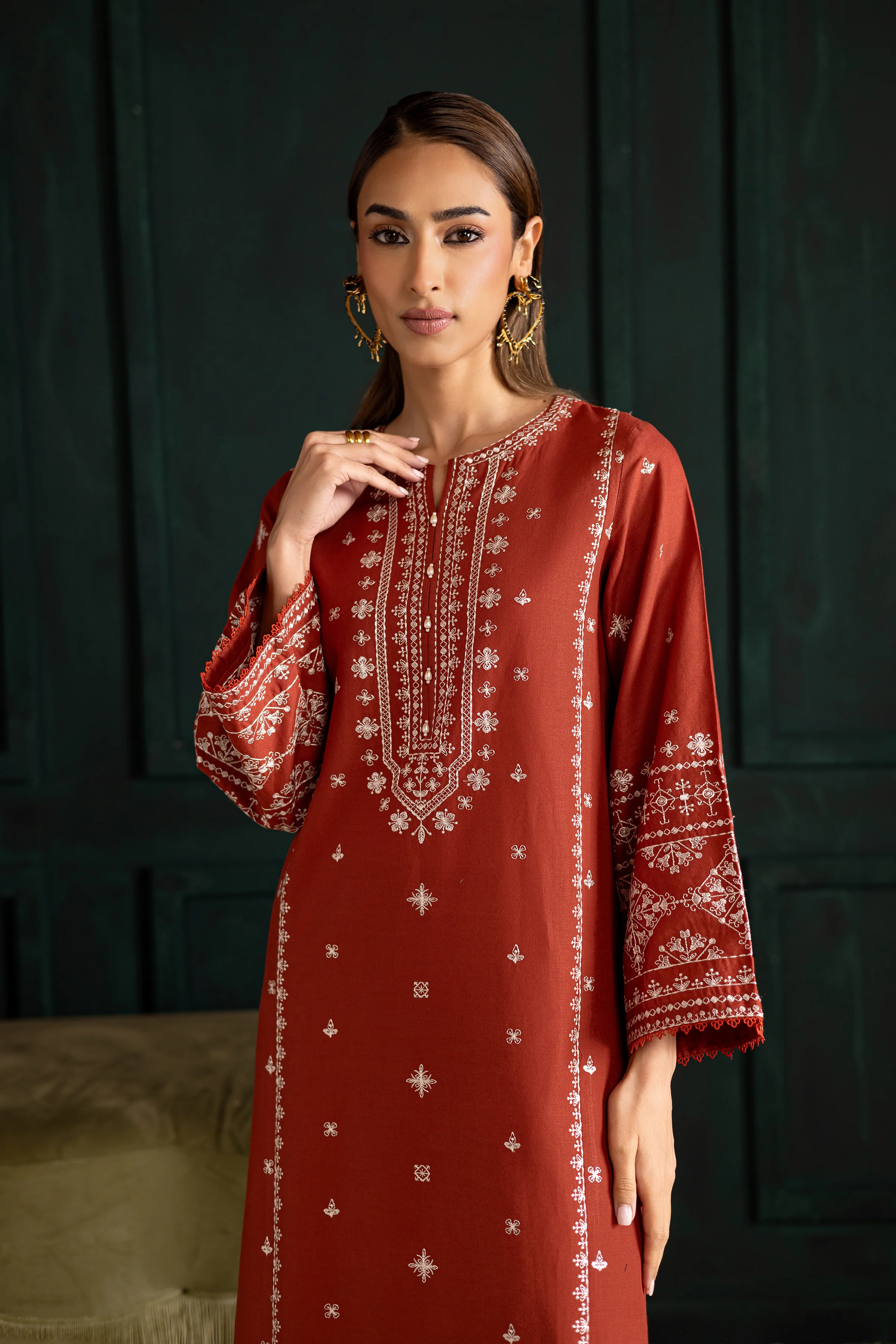 Elevate your wardrobe with this elegant two-piece khaddar Rusty set, showcasing a long shirt featuring a heavily embroidered neckline and all-over spread embroidery for a refined, traditional look. The hemline is tastefully finished with lace, adding a delicate touch of sophistication. The wide sleeves are adorned with intricate embroidery and lace finishing, creating a graceful silhouette that blends style with comfort.